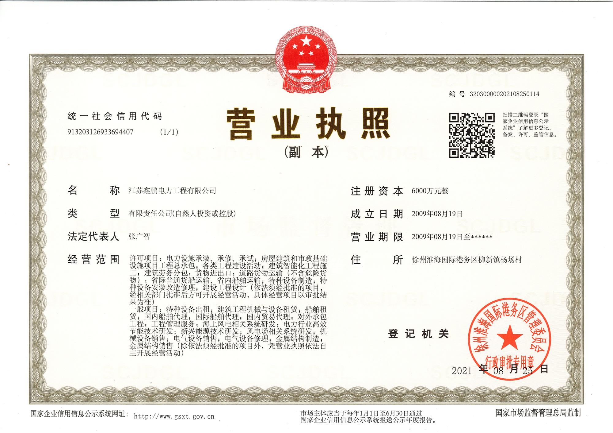 江蘇鑫鵬電力工程有限公司成立于2009年,位于素有“五省通衢”之稱的“古彭”徐州。注冊(cè)資金6000萬(wàn)元,占地50畝。